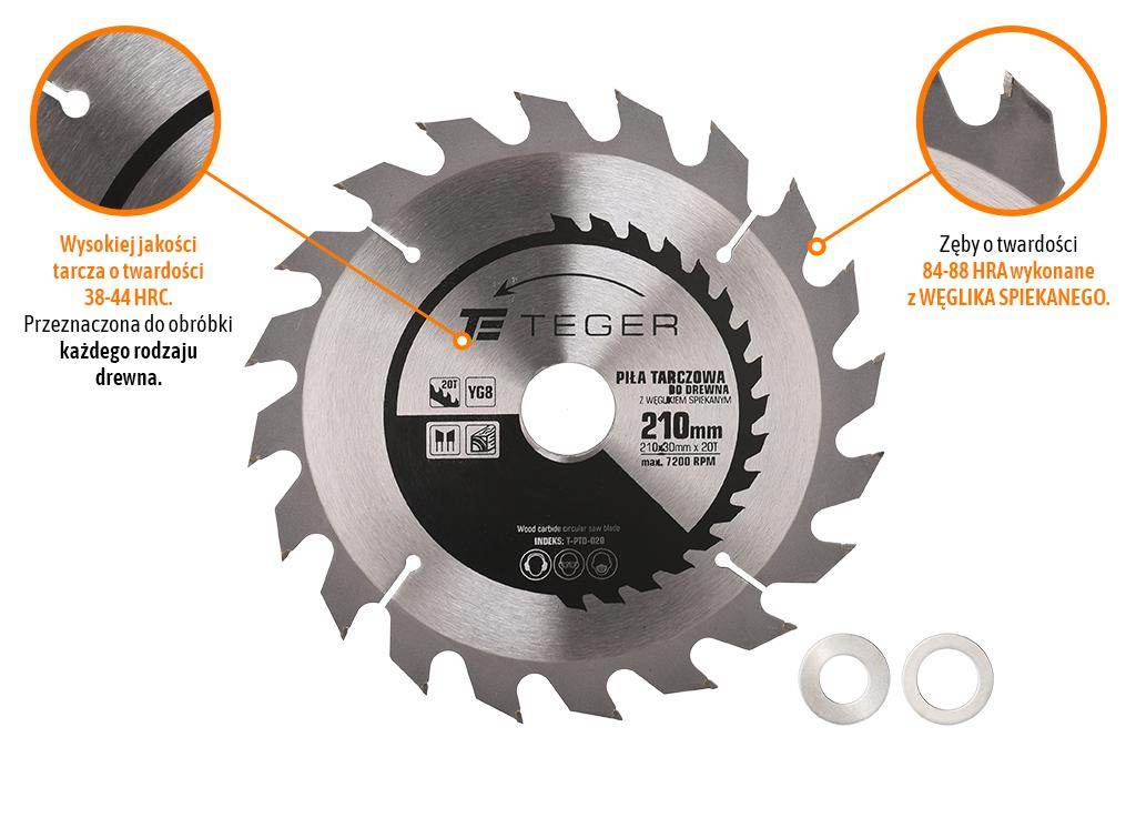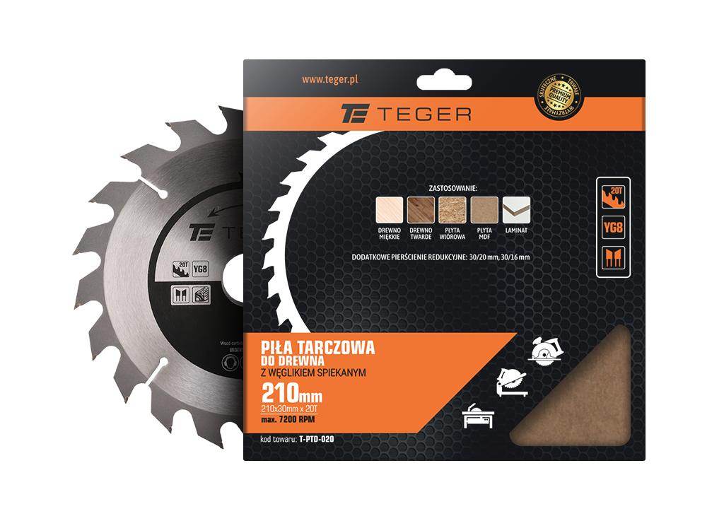 Piła tarczowa do drewna z węglikiem spiekanym 210x30x20t / teger przeznaczona do cięcia wzdłużnego i poprzecznego drewna litego, sklejki, płyt wiórowych, płyt laminowanych i mdf, materiałów drewnopodobnych i kompozytowych. Zęby widiowe z węglikiem spiekanym zapewnia długą żywotność tarczy przy intensywnej pracy.