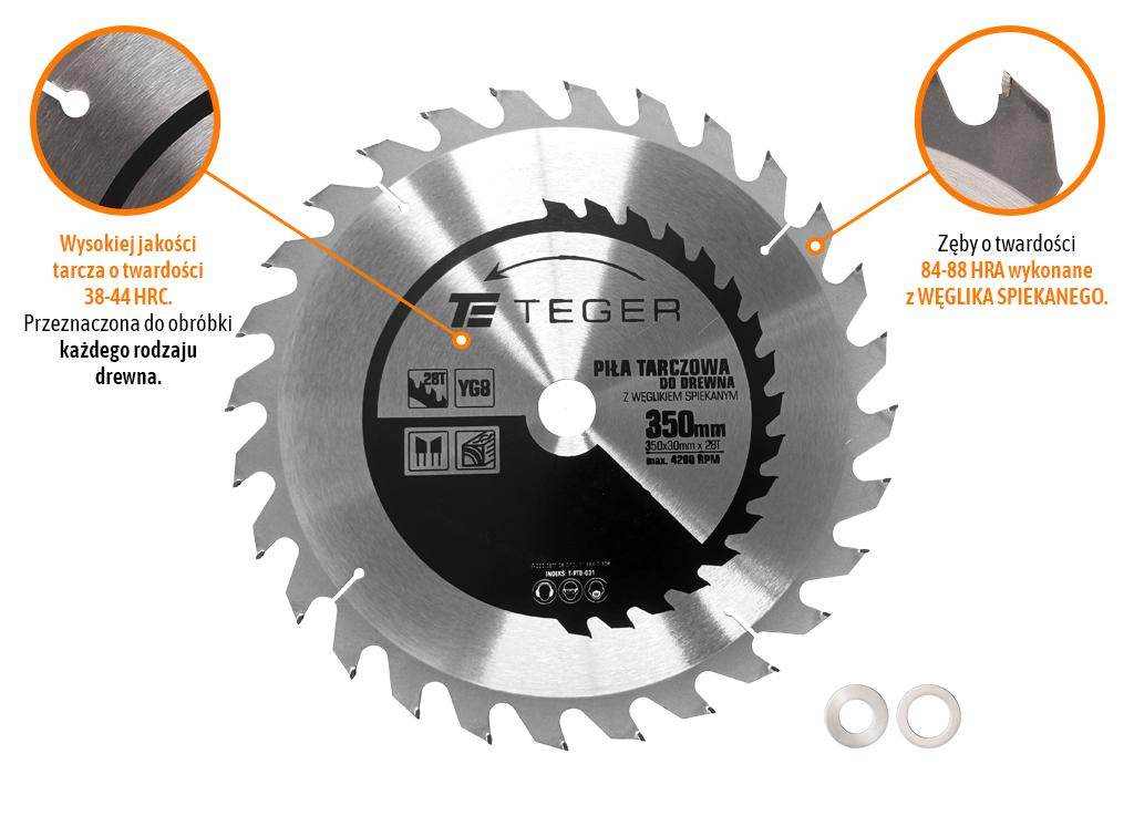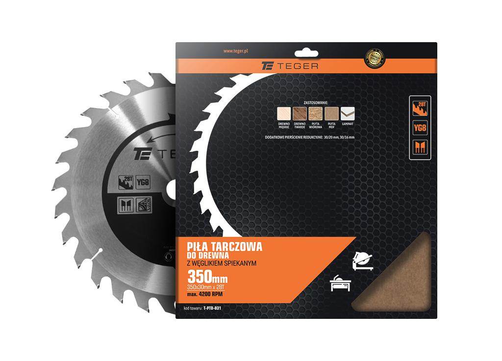 Piła tarczowa do drewna z węglikiem spiekanym 350x30x28t / teger przeznaczona do cięcia wzdłużnego i poprzecznego drewna litego, sklejki, płyt wiórowych, płyt laminowanych i mdf, materiałów drewnopodobnych i kompozytowych. Zęby widiowe z węglikiem spiekanym zapewnia długą żywotność tarczy przy intensywnej pracy.