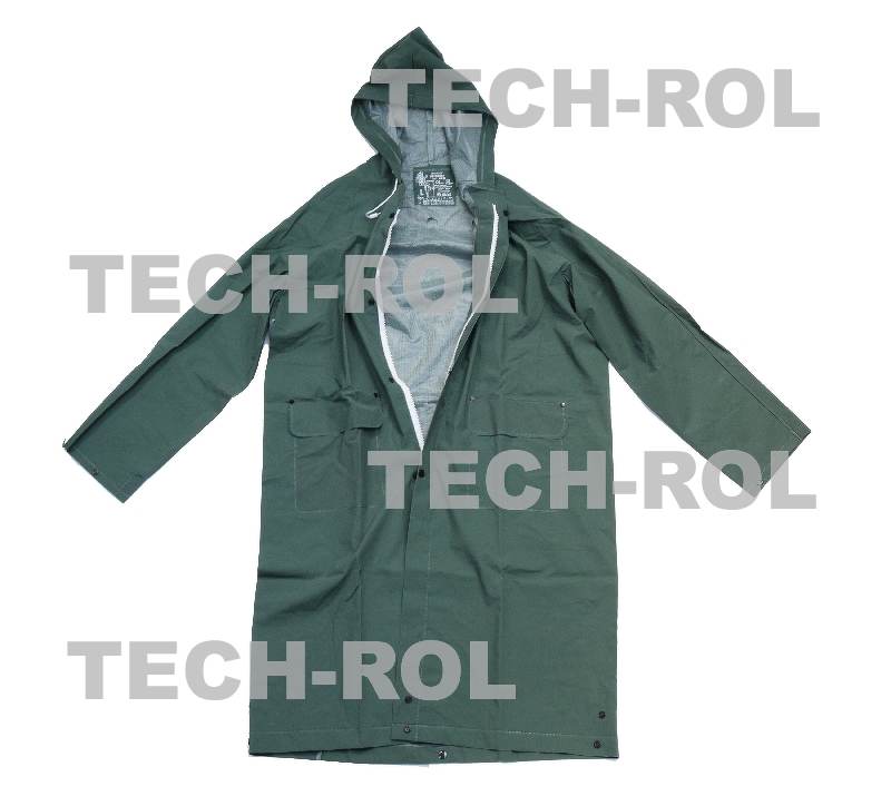 Przeciwdeszczowy płaszcz PCV wykonany z trójwarstwowego, lekkiego i miękkiego materiału PCV/Poliester-PE. Płaszcz długością sięga za kolano. Płaszcz posiada kaptur ściągany trokami i dwie zewnętrzne kryte kieszenie. Płaszcz zapewnie doskonałą ochronę przed deszczem podczas pracy w niekorzystnych warunkach atmosferycznych. Przeznaczony do użytku w pracy i poza nią, w turystyce pieszej, rowerowej, żeglarskiej czy na imprezach masowych.