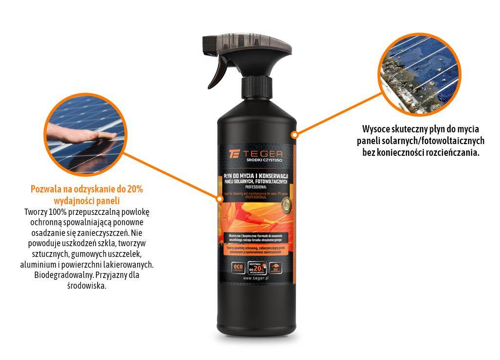 Płyn do mycia i konserwacji paneli solarnych, fotowoltaicznych professional 1l – atomizer / teger wysoce skuteczny płyn do mycia paneli solarnych/fotowoltaicznych bez konieczności rozcieńczania. Specjalnie dobrany atomizer umożliwia łatwą i skuteczną aplikację środka na panele umieszczone na gruncie. Szerokie spektrum działania i doskonałe właściwości umożliwiają skuteczne usuwanie zabrudzeń eksploatacyjnych takich jak: sadza, kurz i pyłki, ptasie odchody oraz osady i nacieki mineralne. Tworzy 100% przepuszczalną powłokę ochronną spowalniającą ponowne osadzanie się zanieczyszczeń. Nie powoduje uszkodzeń szkła, tworzyw sztucznych, gumowych uszczelek, aluminium i powierzchni lakierowanych. Biodegradowalny. Przyjazny dla środowiska. Sposób użycia: wszelkie prace konserwacyjne z użyciem płynu należy przeprowadzać w pochmurne dni lub gdy powierzchnia paneli nie jest gorąca. Preparat nakładać bezpośrednio na czyszczoną powierzchnie metodą natryskową. Pozostawić na ok 1-2 min. Nie dopuszczać do wyschnięcia płynu na powierzchni. Umyć powierzchnie za pomocą odpowiedniej szmatki lub szczotki/myjki do paneli fotowoltaicznych (należy zawsze stosować się do zaleceń producenta paneli). Następnie spłukać gruntownie czystą wodą. W celu zapewnienia najlepszego efektu można użyć wody zdemineralizowanej, a umytą powierzchnie osuszyć za pomocą odpowiedniej ściągaczki (rakli). Uwaga! Nie stosować bezpośrednio na słońcu lub gdy powierzchnia paneli jest gorąca. Zaleca się czyszczenie paneli przynajmniej 2 razy w roku – w sezonach wiosennym i jesiennym.