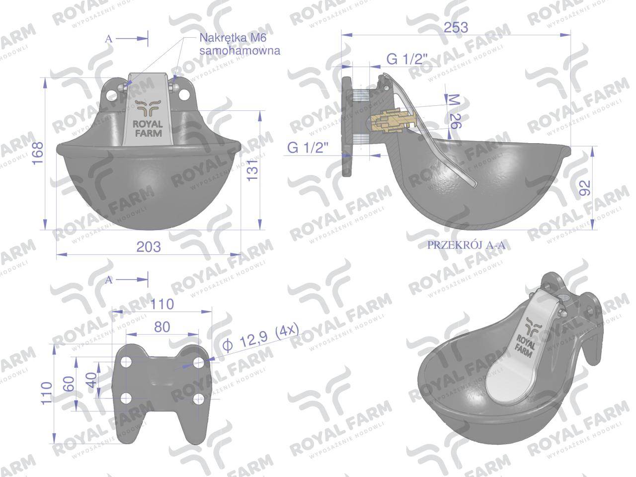 Poidło miskowe żeliwne z językiem ze stali nierdzewnej czarne 1.5l royal farm 2szt