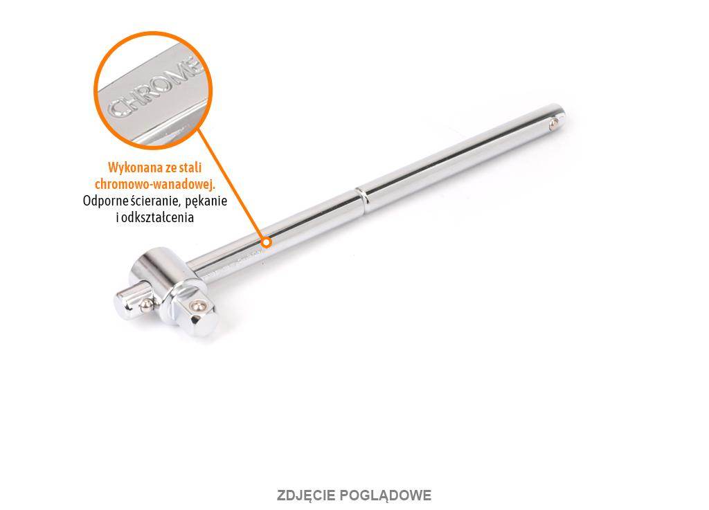 Pokrętło do nasadek typ t 3/4″ 500 mm / teger przeznaczone do odkręcania i dokręcania śrub przy użyciu klucza nasadowego, wyposażone w przesuwny adapter do mocowania klucza. Wykonane ze stopu stali chromowo-wanadowej crv, wytrzymałej na naprężenie statyczne i kinetyczne. Wysoka jakość wykonania, unikalna, polerowana powłoka na powierzchni klucza znacząco zwiększa komfort pracy oraz pozwala na utrzymanie narzędzi w czystości.