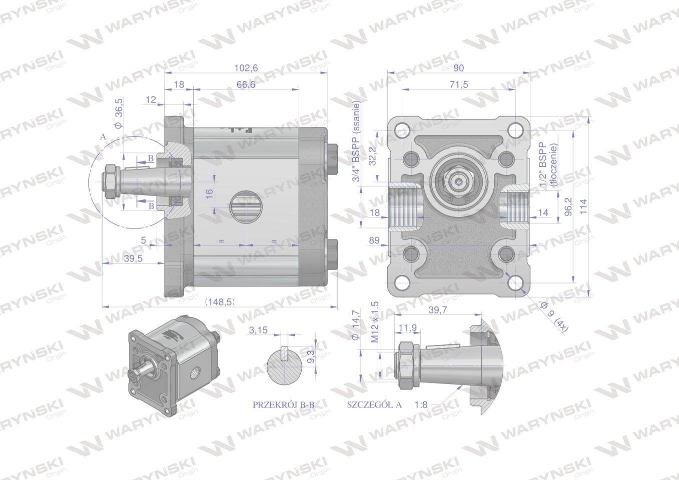 Pompa hydrauliczna zębata 16.0cm3 grupa 2 typ europejski wałek 18 przyłącza gwintowane obroty prawe max.260 bar waryński