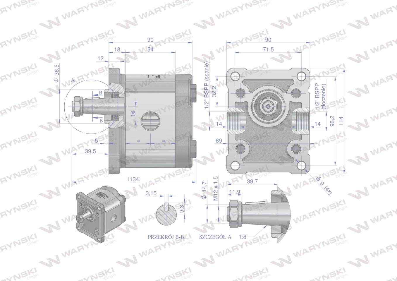 Pompa hydrauliczna zębata 8.0cm3 grupa 2 typ europejski wałek 18 przyłącza gwintowane obroty prawe max.260 bar waryński