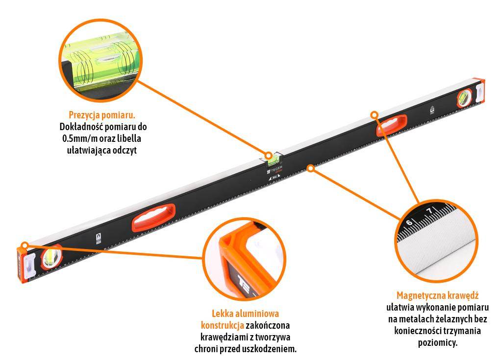 Poziomnica aluminiowa/magnetyczna 150 cm extreme / teger profesjonalna poziomnica aluminiowa, przeznaczona do wyznaczania pionu i poziomu powierzchni. Niezwykle wszechstronna i kompaktowa. Magnetyczna krawędź umożliwia dokonanie pomiaru bez konieczności przytrzymywania poziomicy rękoma w przypadku pracy z materiałami metalowymi. Precyzyjne libelle o podwyższonej dokładności pomiaru, obustronna laserowo znaczona skala mierząca, specjalny kształt aluminiowego profilu oraz zwiększona odporności na uszkodzenia zadbają o jakość i ergonomię pracy zarówno profesjonalistów jak i domowych majsterkowiczów.