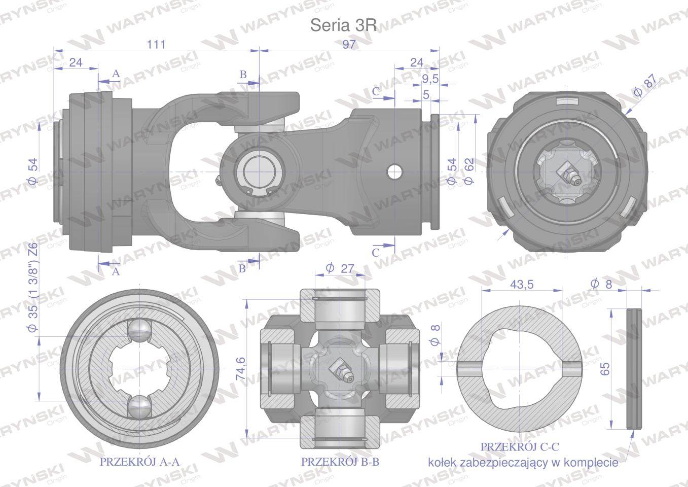 Przegub kompletny z krzyżakiem 27x74.6 seria 3 do rury zewnętrznej 43.5mm waryński