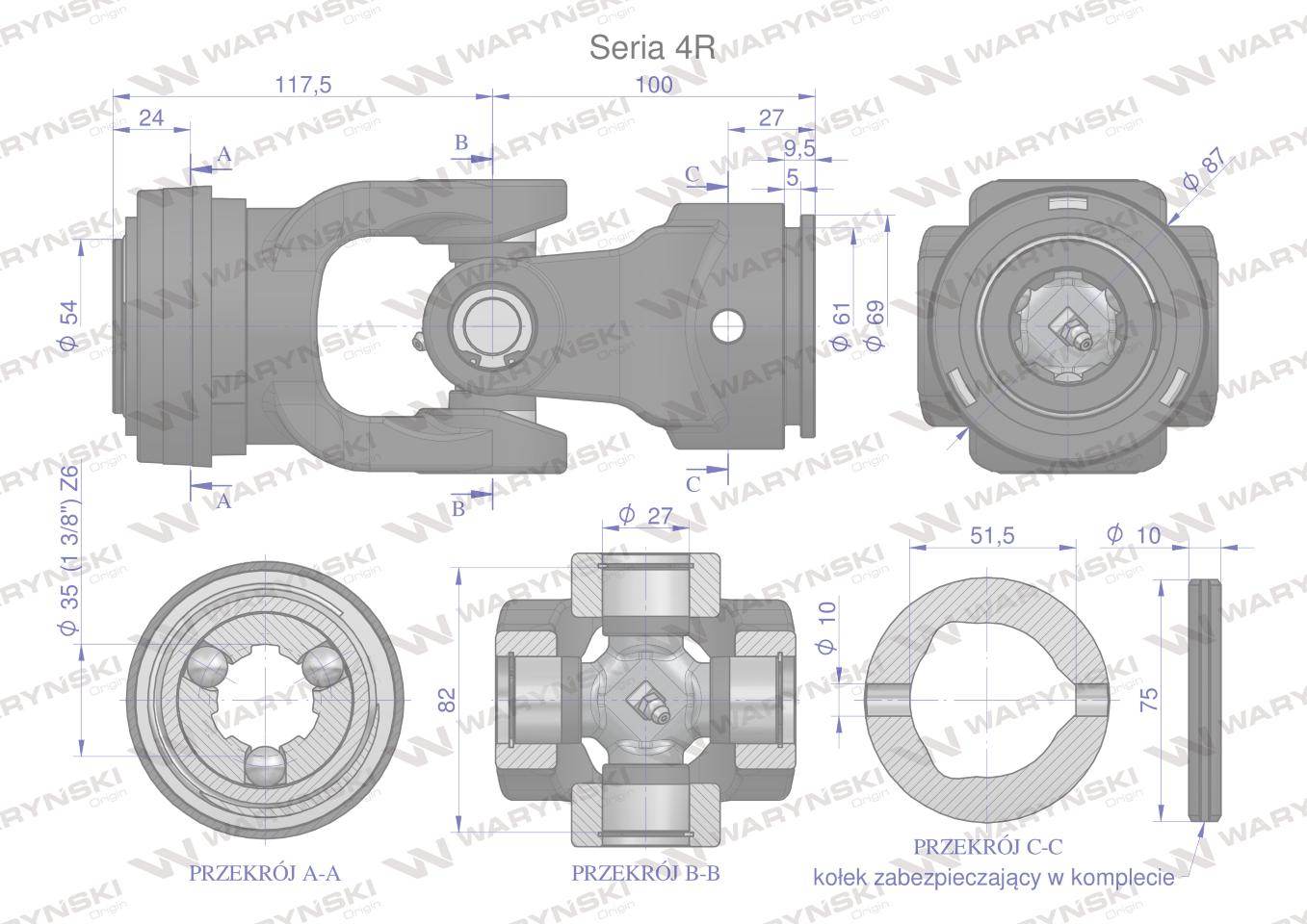 Przegub kompletny z krzyżakiem 27x82 seria 4 do rury zewnętrznej 51.5mm waryński