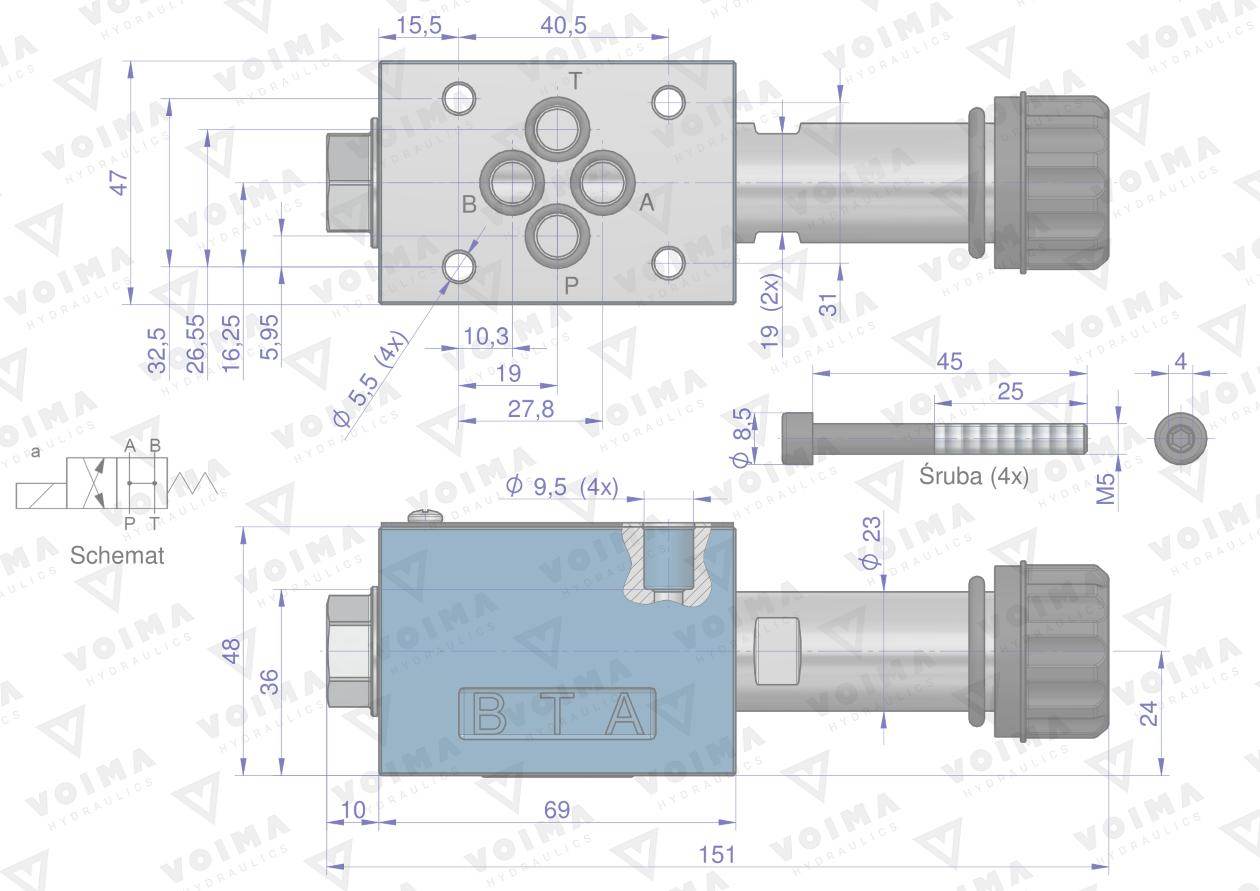 Rozdzielacz (elektrozawór cetop 3 ng6) 2-pozycyjny 50l suwak „ha” voima (do opryskiwacza). Rozdzielacz suwakowy, sterowany elektycznie. Kompaktowe, niewielkie wymiary elektrozaworu i samych cewek pozwalają na montaż w hydraulice mobilnej, przenośnych zasilaczach, rolnictwie. Suwak „ha” typu sa2. Przygotowany do montażu odpowieniej cewki voima.