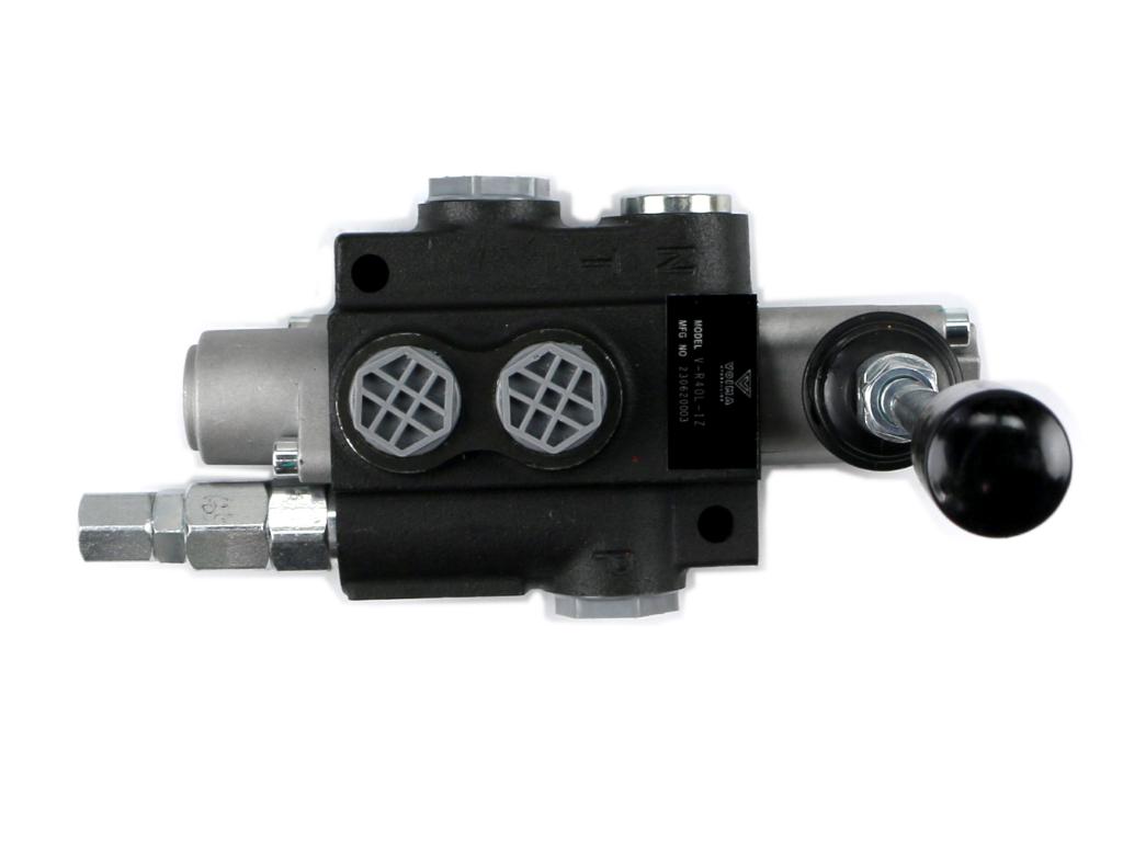 Rozdzielacz hydrauliczny 1-sekcyjny 40l z zatrzaskiem voima – monoblokowy z układem równoległym z neutralną pozycją środkową. Olej w pozycji neutralnej krąży między pompą hydrauliczną a zbiornikiem.