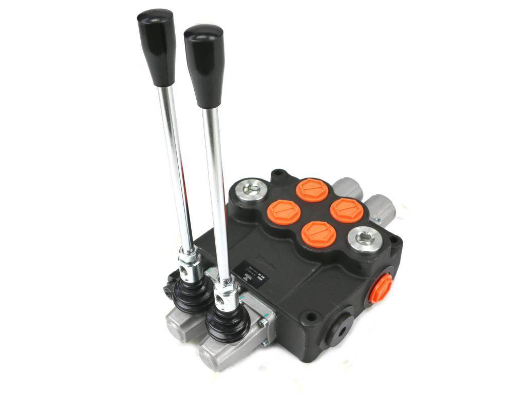 Rozdzielacz hydrauliczny 2-sekcyjny 120l voima – monoblokowy z układem równoległym z neutralną pozycją środkową. Olej w pozycji neutralnej krąży między pompą hydrauliczną a zbiornikiem.