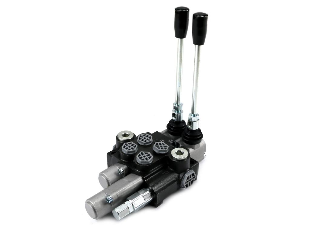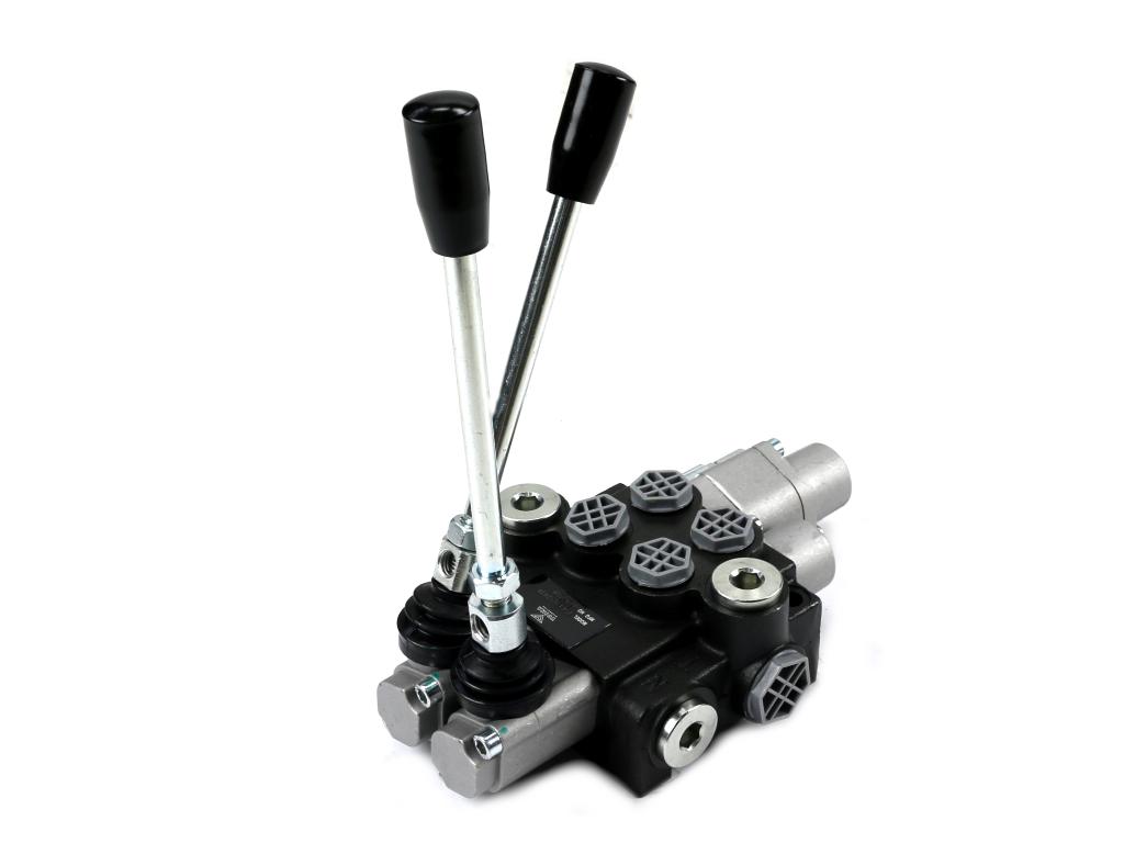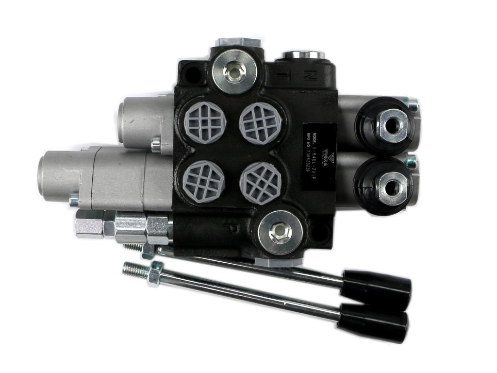 Rozdzielacz hydrauliczny 2-sekcyjny 40l (1-sekcja pływająca) voima – monoblokowy z układem równoległym z neutralną pozycją środkową. Olej w pozycji neutralnej krąży między pompą hydrauliczną a zbiornikiem. Jedna sekcja: pływająca (z zatrzaskiem).
