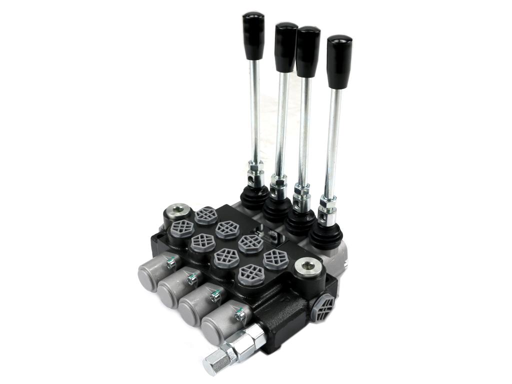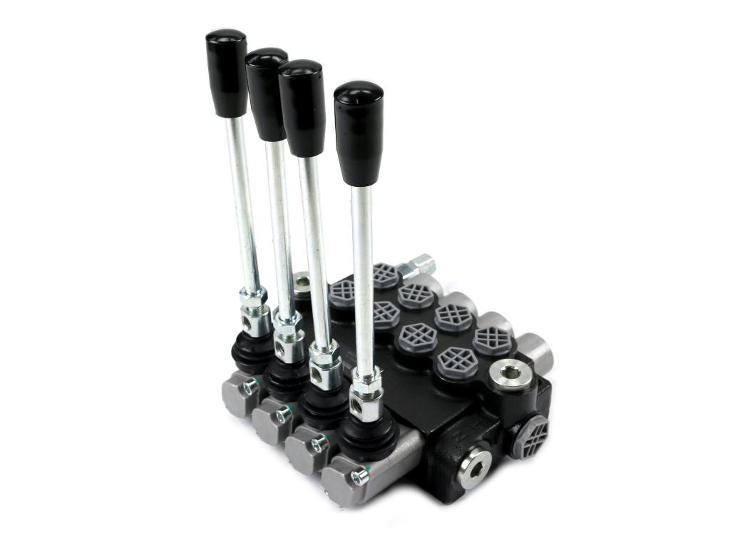 Rozdzielacz hydrauliczny 4-sekcyjny 40l voima – monoblokowy z układem równoległym z neutralną pozycją środkową. Olej w pozycji neutralnej krąży między pompą hydrauliczną a zbiornikiem.