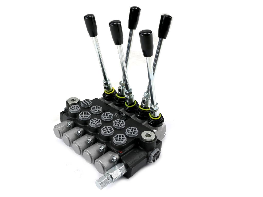 Rozdzielacz hydrauliczny 5-sekcyjny 40l z zatrzaskami na 5 sekcjach voima – monoblokowy z układem równoległym z neutralną pozycją środkową. Olej w pozycji neutralnej krąży między pompą hydrauliczną a zbiornikiem.