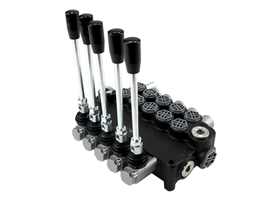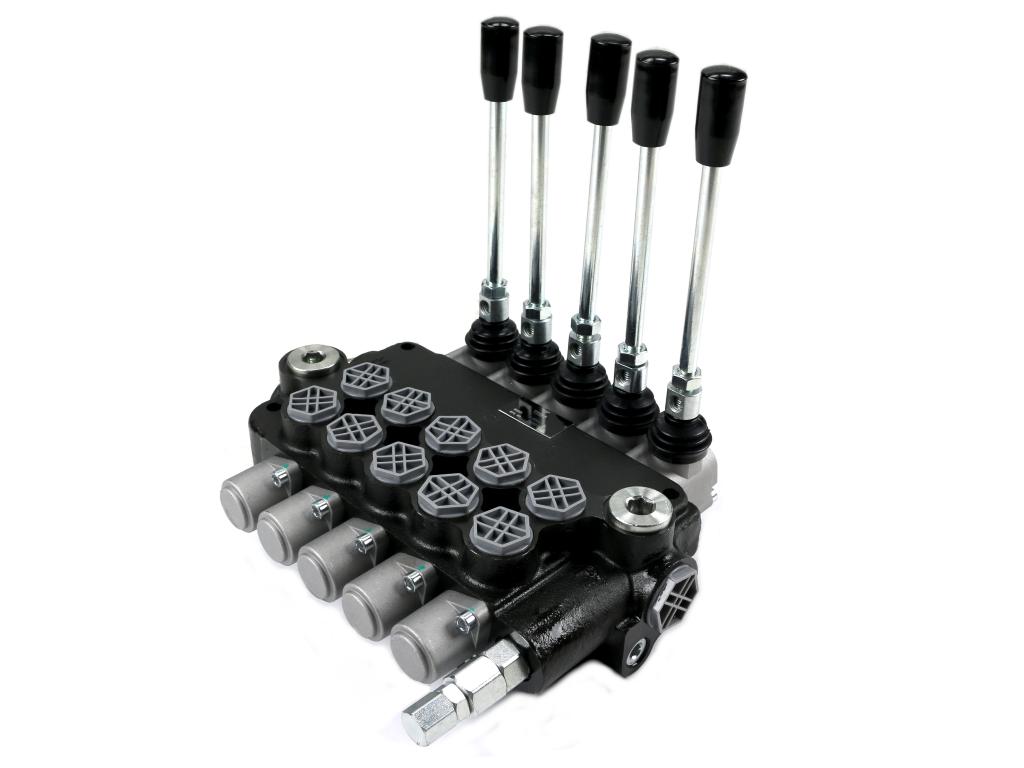 Rozdzielacz hydrauliczny 5-sekcyjny 80l voima – monoblokowy z układem równoległym z neutralną pozycją środkową. Olej w pozycji neutralnej krąży między pompą hydrauliczną a zbiornikiem.