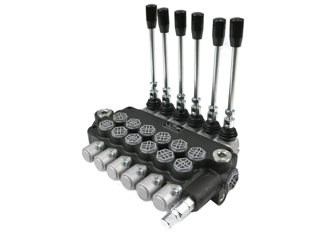 Rozdzielacz hydrauliczny 6-sekcyjny 80l voima – monoblokowy z układem równoległym z neutralną pozycją środkową. Olej w pozycji neutralnej krąży między pompą hydrauliczną a zbiornikiem.