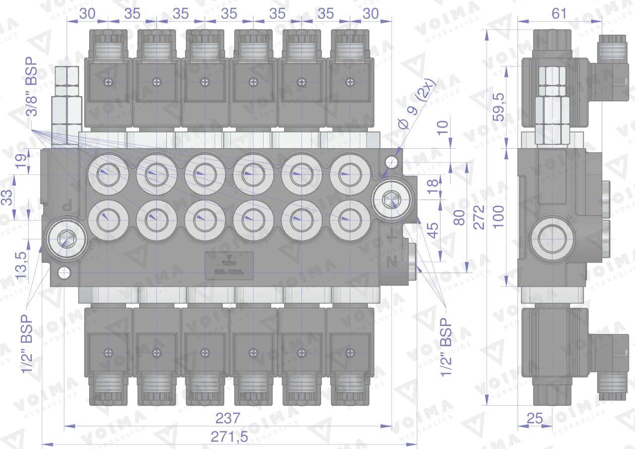 Rozdzielacz hydrauliczny 6-sekcyjny sterowany elektrycznie 12v 40l voima – monoblokowy z układem równoległym z neutralną pozycją środkową. Olej w pozycji neutralnej krąży między pompą hydrauliczną a zbiornikiem.