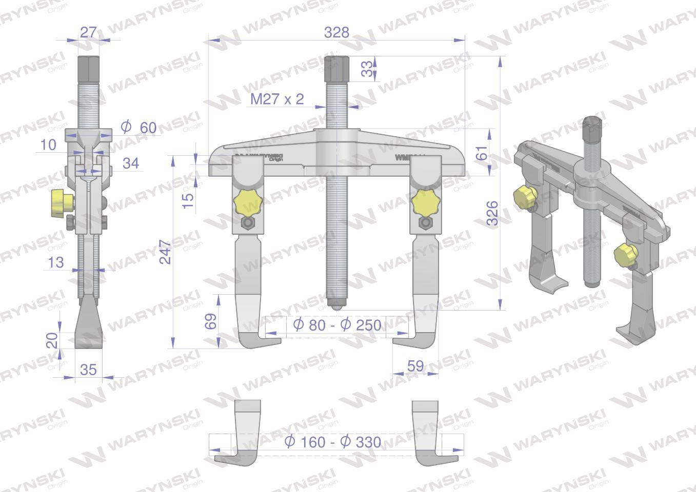 Ściągacz 160 x 330mm do łożysk lub tulei, dwuramienny, typ t, odwracalne ramiona o możliwym dwustronnym podbieraniu łożysk. Zewnętrznie pasujący do średnic 160-330mm, wewnętrznie pasuje do średnic 80-250mm waryński