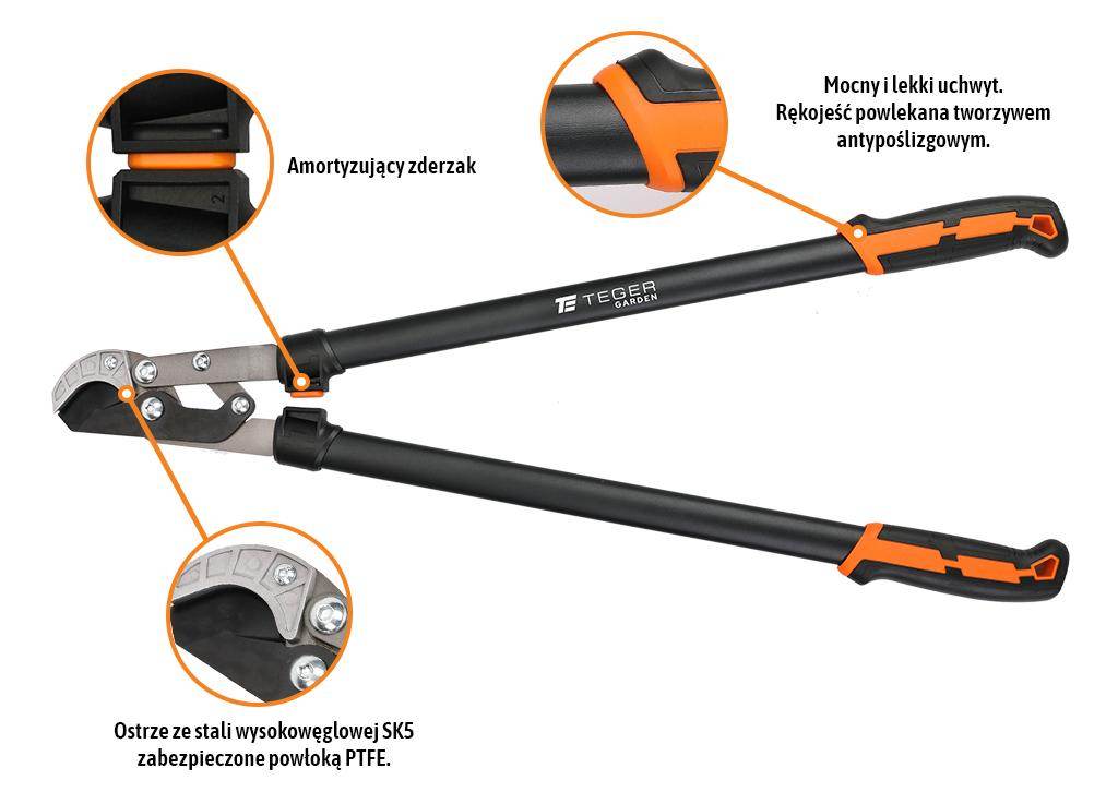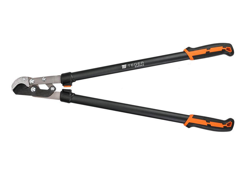 Sekator kowadełkowy – dwuręczny z przekładnią / teger / to precyzyjne narzędzie do pielęgnacji ogrodu. Dzięki zastosowanej przekładni zapewnia większą siłę cięcia, co wymaga mniej wysiłku od użytkownika. Ostrze ze stali węglowej umożliwia łatwe cięcie każdych gałęzi w tym suchych i twardych o grubości do 40mm. Wygodna, ergonomiczna rękojeść z miękkimi elementami doskonale leży w dłoni, zapewniając komfortową pracę.