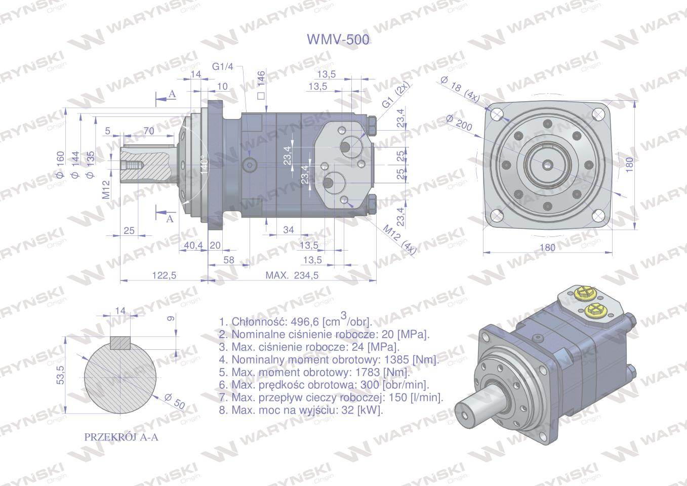 Silnik hydrauliczny orbitalny wmv 500 cm3/obr 200 bar max.280 bar waryński