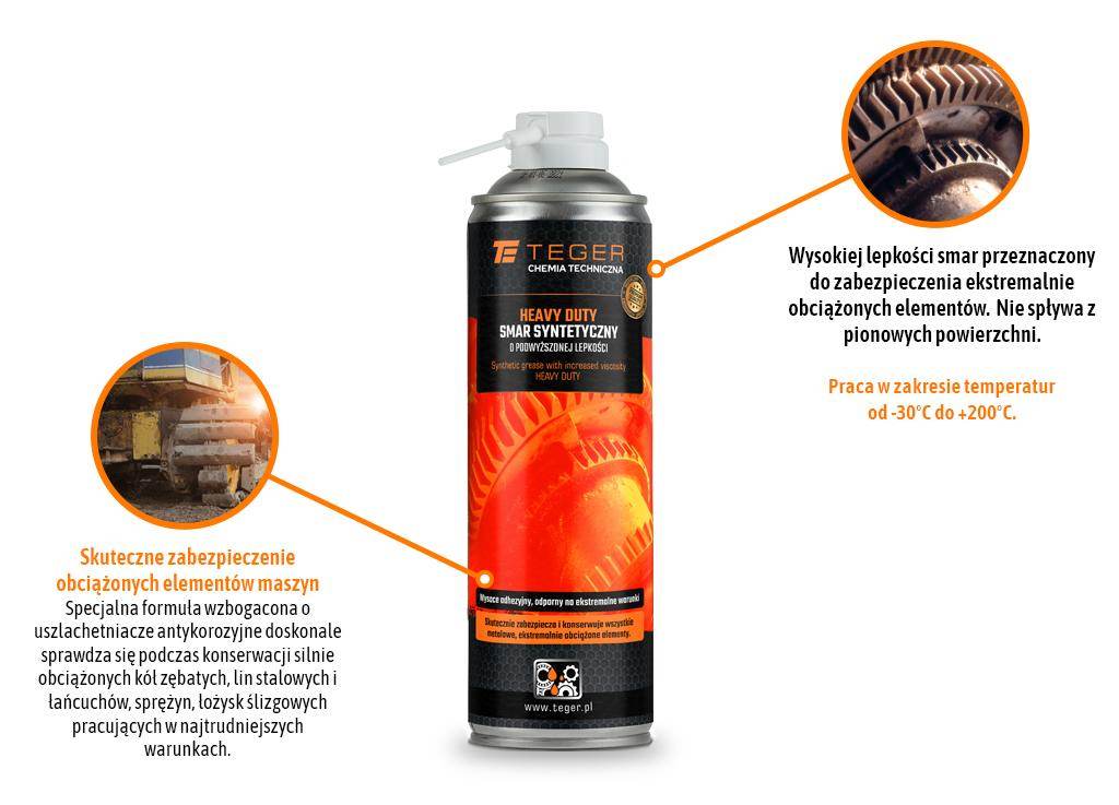 Smar syntetyczny o podwyższonej lepkości – heavy duty -30⁰c do 200⁰c 500 ml / teger wysokiej lepkości smar przeznaczony do zabezpieczenia ekstremalnie obciążonych elementów. Nie spływa z pionowych powierzchni. Specjalna formuła wzbogacona o uszlachetniacze antykorozyjne doskonale sprawdza się podczas konserwacji silnie obciążonych kół zębatych, lin stalowych i łańcuchów, sprężyn, łożysk ślizgowych pracujących w najtrudniejszych warunkach. Przeznaczony do smarowania elementów w przemyśle motoryzacyjnym, hutniczym, stoczniowym, wydobywczym, chemicznym, drzewnym i poligraficznym. Praca w zakresie temperatur od -30°c do +200°c. Sposób użycia: przed użyciem silnie wstrząsnąć. Na oczyszczoną powierzchnię natryskiwać smar z odległości 10-20 cm. Magazynowanie: pojemnik pod ciśnieniem, chronić przed promieniami słonecznymi i temperaturą powyżej 50°c.