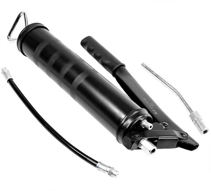 Ręczna smarownica o pojemności 500ml, w zestawie z wężykiem giętkim ułatwiającym pracę w miejscach trudno dostępnych.