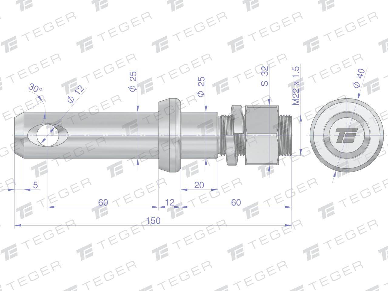 Sworzeń z gwintem t-sg25602550150 fi 25/60mm m22x1.5/40mm 150mm teger