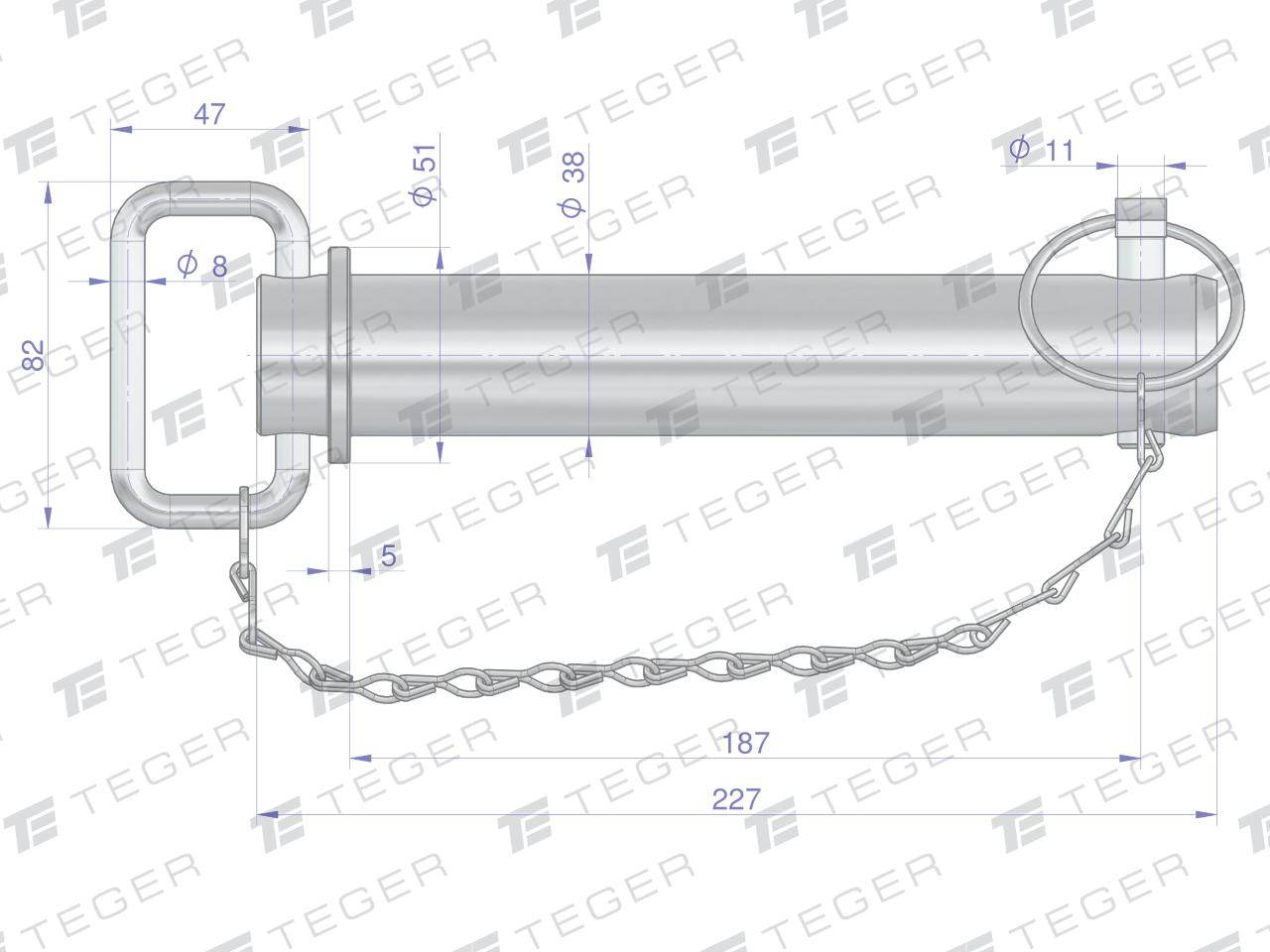 Sworzeń zaczepu z zawleczką i łańcuchem 38x187x227 teger