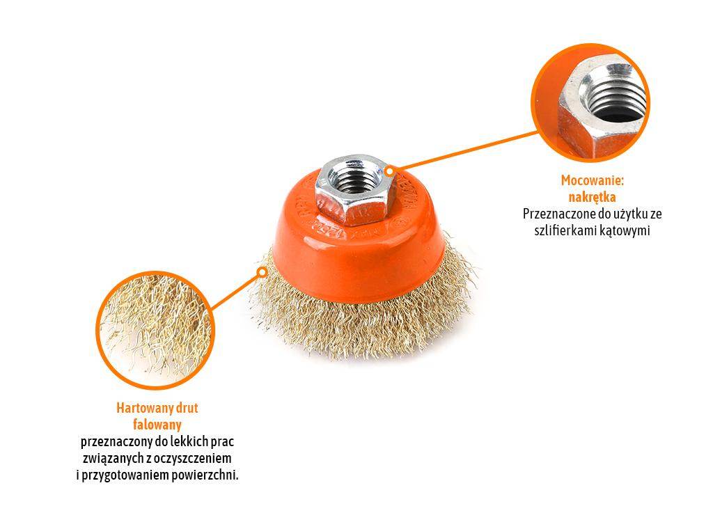 Szczotka doczołowa z nakrętką – drut falowany m14/60 mm / teger przeznaczona do powierzchniowej obróbki elementów metalowych i stalowych przy pomocy szlifierki kątowej. Skutecznie usuwa stare warstwy farb czy lakierów, usuwa ogniska korozji i naloty. Doczołowy kształt szczotki umożliwia szybką obróbkę płaskich powierzchni a idealne wyważenie zapewnia niski poziom wibracji. Zastosowany w szczotce drut charakteryzuje się dużą elastycznością i zdolnością do odkształcania przez co idealnie nadaje się do materiałów wymagających mniej agresywnej obróbki.