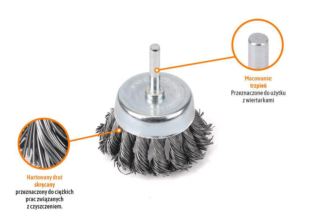 Szczotka doczołowa z trzpieniem – drut skręcany fi 6/60 mm / teger przeznaczona do powierzchniowej obróbki elementów metalowych i stalowych przy pomocy wiertarek i wkrętarek ręcznych. Skutecznie usuwa stare warstwy farb czy lakierów, usuwa ogniska korozji i naloty. Nadaje się również do wygładzania krawędzi i likwidowania zadziorów. Doczołowy kształt szczotki umożliwia szybką obróbkę płaskich powierzchni a idealne wyważenie zapewnia niski poziom wibracji. Zastosowany w szczotce drut charakteryzuje się dużą sztywnością co sprawdza się podczas agresywnej obróbki materiałów.