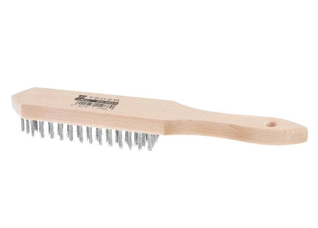 Szczotka druciana do rdzy standard – drut stalowy / 4 rzędowa / teger / to idealne narzędzie do czyszczenia metalowych powierzchni. Umożliwia ona usunięcie zabrudzeń oraz rdzy, a także pozwala odnowić i przygotować powierzchnię do malowania. Oprawa wykonana jest z wysokiej jakości drewna bukowego, w którym obsadzone jest włosie ze stalowego drutu hartowanego. Ergonomiczny uchwyt zapewnia doskonały komfort pracy a sam produkt zachowuje trwałość przez długi czas eksploatacji.