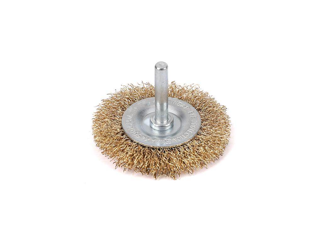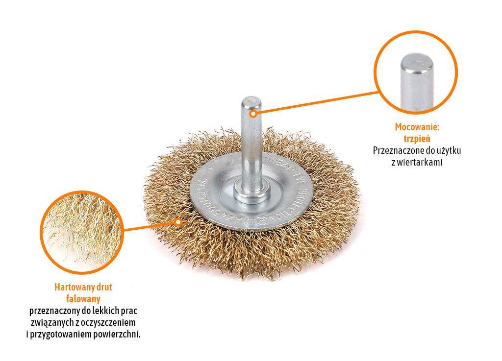 Szczotka tarczowa z trzpieniem – drut falowany fi 6/60 mm / teger przeznaczona do powierzchniowej obróbki elementów metalowych i stalowych przy pomocy wiertarek i wkrętarek ręcznych. Skutecznie usuwa stare warstwy farb czy lakierów, usuwa ogniska korozji i naloty. Tarczowy kształt szczotki umożliwia szybką obróbkę wąskich powierzchni o nieregularnych kształtach a idealne wyważenie zapewnia niski poziom wibracji. Zastosowany w szczotce drut charakteryzuje się dużą elastycznością i zdolnością do odkształcania przez co idealnie nadaje się do materiałów wymagających mniej agresywnej obróbki.