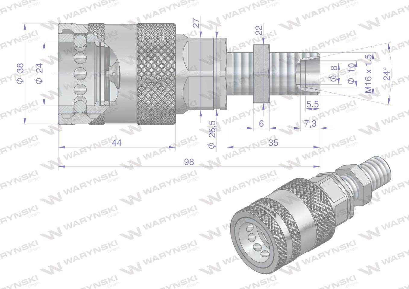 Szybkozłącze hydrauliczne gniazdo long m16x1.5 gwint zewnętrzny euro push-pull (iso 7241-a) z eliminatorem ciśnienia waryński. Eliminator ciśnienia umożliwia połączenie hydrauliki bez potrzeby stosowania nadmiernej siły, co zapewnia szybki i łatwy proces połączenia w każdej sytuacji (statyczne ciśnienie pomiędzy dwoma systemami hydraulicznymi jest rozprężane). Jest to idealne rozwiązanie łączenia hydrauliki o bardzo szerokim spektrum zastosowań. Ten rodzaj wykonania gniazda szybkozłącza zabezpiecza również przed pęknięciem/zerwaniem przewodu hydraulicznego i utratą oleju hydraulicznego w przypadku jego niezamierzonego naciągnięcia – np. odjazd ciągnika bez odczepienia hydrauliki z podłączonej maszyny (montaż gniazda szybkozłącza do korpusu/obudowy w ciągniku za tuleję blokującą). Szybkozłącza zaprojektowane są zgodnie z wymogami wymiarowymi i jakościowymi normy iso 7241 seria a, która określa szczegółowo charakterystykę i wymiary, aby umożliwić kompatybilność szybkozłączy produkowanych przez różnych producentów zgodnie z tym standardem. Zamienne z szybkozłączami iso-a innych producentów takich jak: parker, faster, stucchi, dnp, tema i innych.