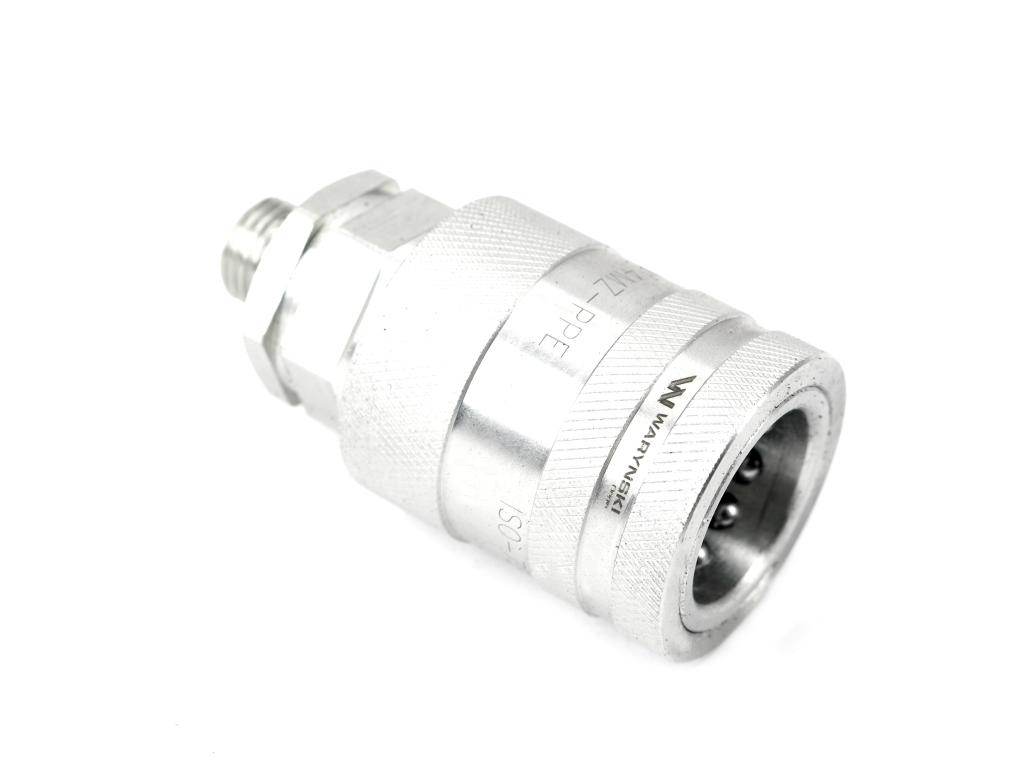 Szybkozłącze hydrauliczne gniazdo m14x1.5 gwint zewnętrzny euro push-pull (iso 7241-a) z eliminatorem ciśnienia waryński. Eliminator ciśnienia umożliwia połączenie hydrauliki bez potrzeby stosowania nadmiernej siły, co zapewnia szybki i łatwy proces połączenia w każdej sytuacji (statyczne ciśnienie pomiędzy dwoma systemami hydraulicznymi jest rozprężane). Jest to idealne rozwiązanie łączenia hydrauliki o bardzo szerokim spektrum zastosowań. Ten rodzaj wykonania gniazda szybkozłącza zabezpiecza również przed pęknięciem/zerwaniem przewodu hydraulicznego i utratą oleju hydraulicznego w przypadku jego niezamierzonego naciągnięcia – np. odjazd ciągnika bez odczepienia hydrauliki z podłączonej maszyny (montaż gniazda szybkozłącza do korpusu/obudowy w ciągniku za tuleję blokującą). Szybkozłącza zaprojektowane są zgodnie z wymogami wymiarowymi i jakościowymi normy iso 7241 seria a, która określa szczegółowo charakterystykę i wymiary, aby umożliwić kompatybilność szybkozłączy produkowanych przez różnych producentów zgodnie z tym standardem. Zamienne z szybkozłączami iso-a innych producentów takich jak: parker, faster, stucchi, dnp, tema i innych.