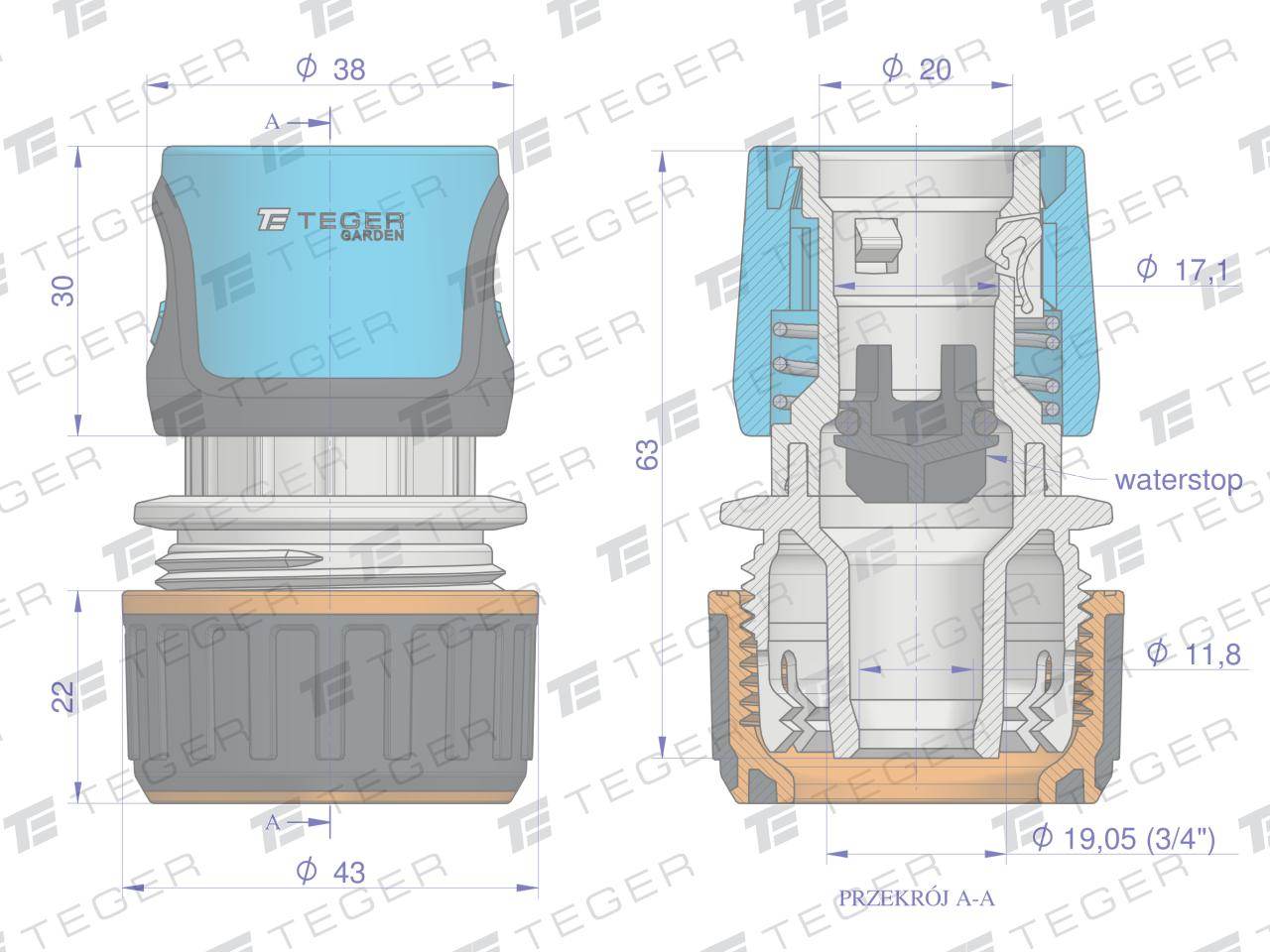 Szybkozłączka 3/4″ z waterstop teger