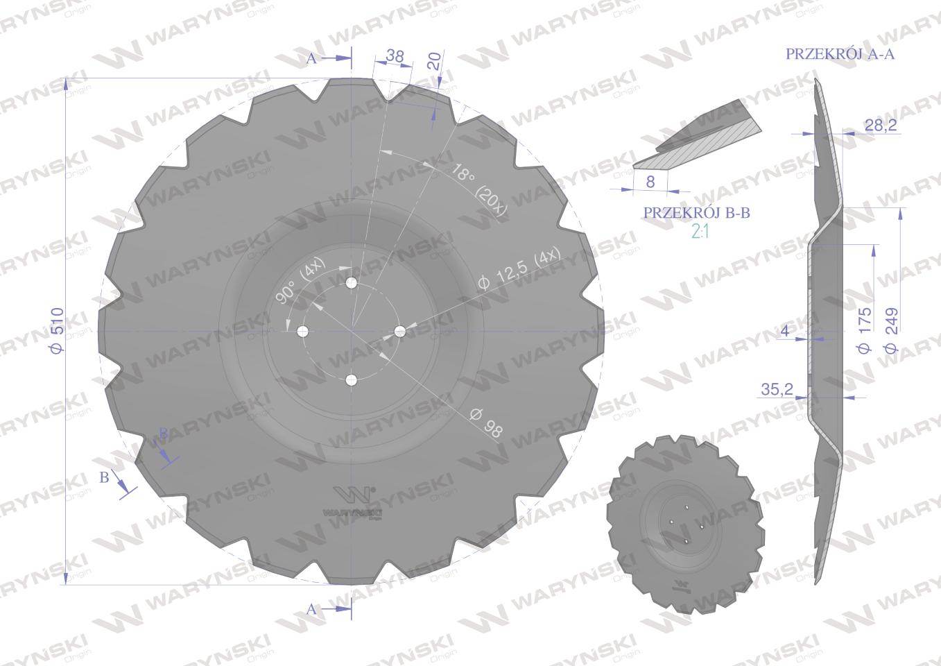 Talerz uzębiony z-20 fi 510 mocowanie 4/98 grubość 4mm przetłoczony stal borowa waryński r