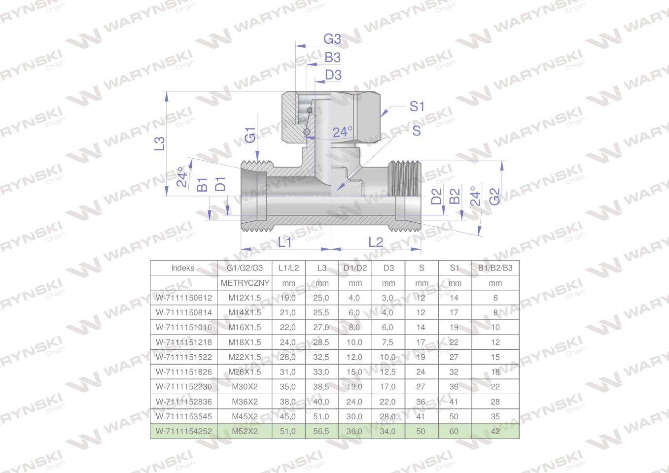 Trójnik hydrauliczny symetryczny metryczny bab m52x2 42l (xevt) waryński. Elementy złączne zostały zaprojektowane i wykonane zgodnie z obowiązującymi normami, które szczegółowo opisują wymagania jakościowe i wymiarowe. Są kompatybilne z elementami złącznymi innych renomowach producentów hydrauliki siłowej.
