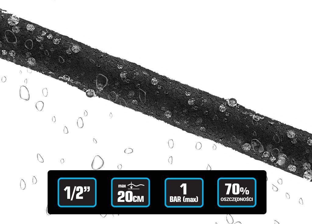 Wąż ogrodowy – kroplujący fi 1/2″, 20m / teger / szczególnie skuteczny przy niskim ciśnieniu wody, umożliwia wyjątkowo oszczędne i precyzyjne nawadnianie roślin na małych i dużych obszarach, co w efekcie powiększa uzyskane plony. Zaletą węża jest równomierne przepuszczanie wody na całej jego długości w postaci dużych kropli. Pozwala znacząco obniżyć koszty nawadniania upraw. Podłączenie zasilania wody odbywa się poprzez standardowe szybkozłącze, możliwe jest również łączenie elementów w dowolny sposób – idealny do upraw warzywnych, kwiatowych i owocowych. Wąż może być używany na powierzchni lub 20 cm pod powierzchnią gruntu.