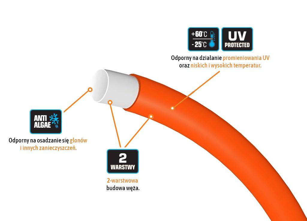 Wąż ogrodowy – tłoczny do pomp zanurzeniowych fi 5/4″, 10m / teger / przeznaczony do tłoczenia wody i ścieków o ciśnieniu roboczym nie większym niż 1 bar. Wykonany z elastycznego pcw w kolorze pomarańczowym na bazie suspensyjnego polichlorku winylu, tereftalanu, kauczuku syntetycznego oraz innych komponentów, posiadający szerokie zastosowanie w przemyśle, rolnictwie i ogrodnictwie. Nie zawierający kadmu i ołowiu, wysoce elastyczny, odporny na działanie kwasów i zasad, promieni uv oraz niskich temperatur. Zakres temperatur od -25°c do +60°c.