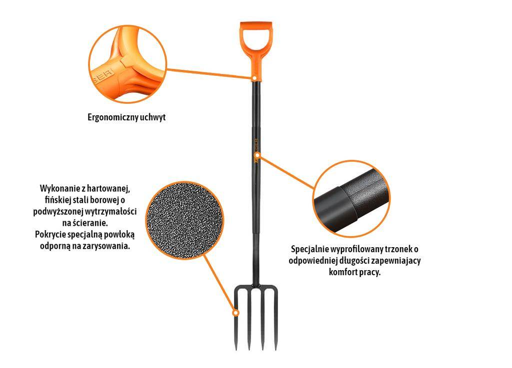 Widły ogrodowe, tzw. amerykańskie, z trzonkiem metalowym teger wykonana są ze stali hartowanej borowej fińskiej o podwyższonej wytrzymałości na ścieranie. Odpowiednio dobrana długość, specjalnie wyprofilowany trzonek, ergonomiczny uchwyt oraz kąt nachylenia minimalizuje napięcie pleców i ramion podczas prac. Indeks rączki t-o-racz032 teger