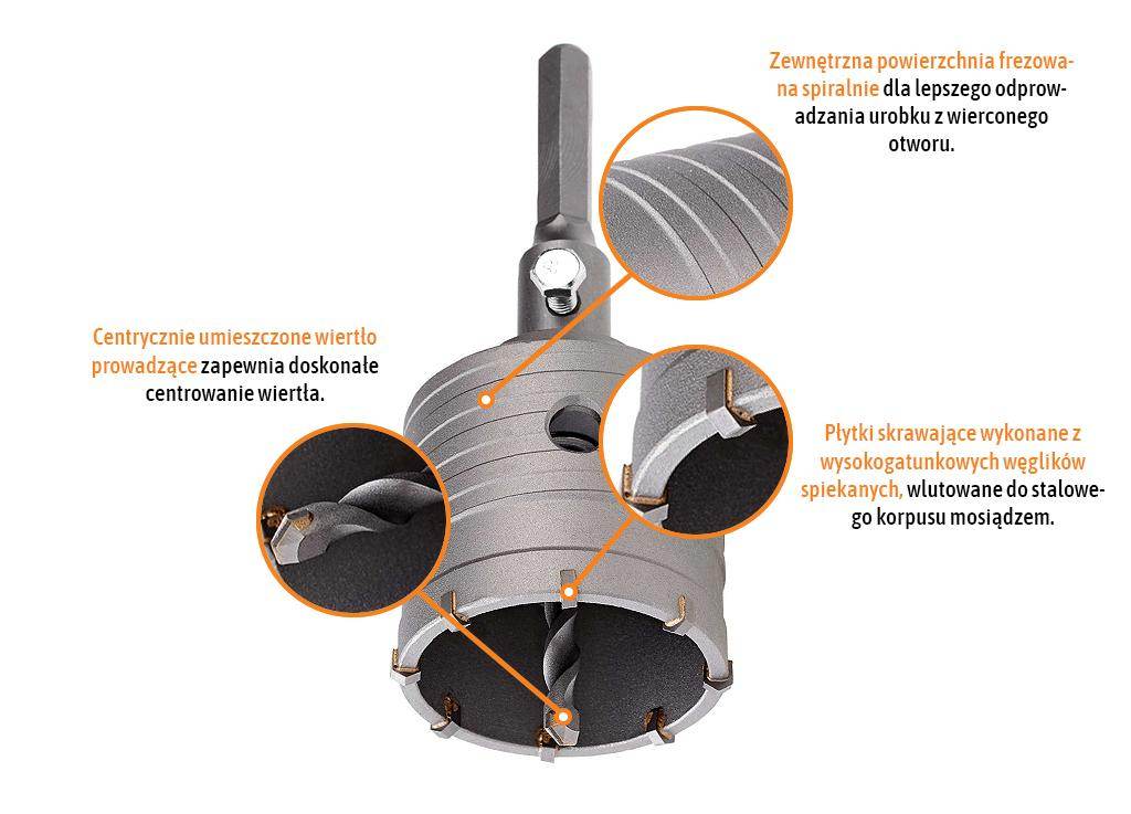 Wiertło do betonu koronowe – uchwyt hex mm / 65 mm mm / teger wyposażone w płytki skrawające wykonane z wysokogatunkowych węglików spiekanych, wlutowanych do stalowego korpusu mosiądzem. Zewnętrzna powierzchnia frezowana spiralnie dla lepszego odprowadzania urobku z wierconego otworu zapewniająca długą żywotność wiertła. Stabilność korpusu koronki gwarantuje wysoką wydajność pracy.