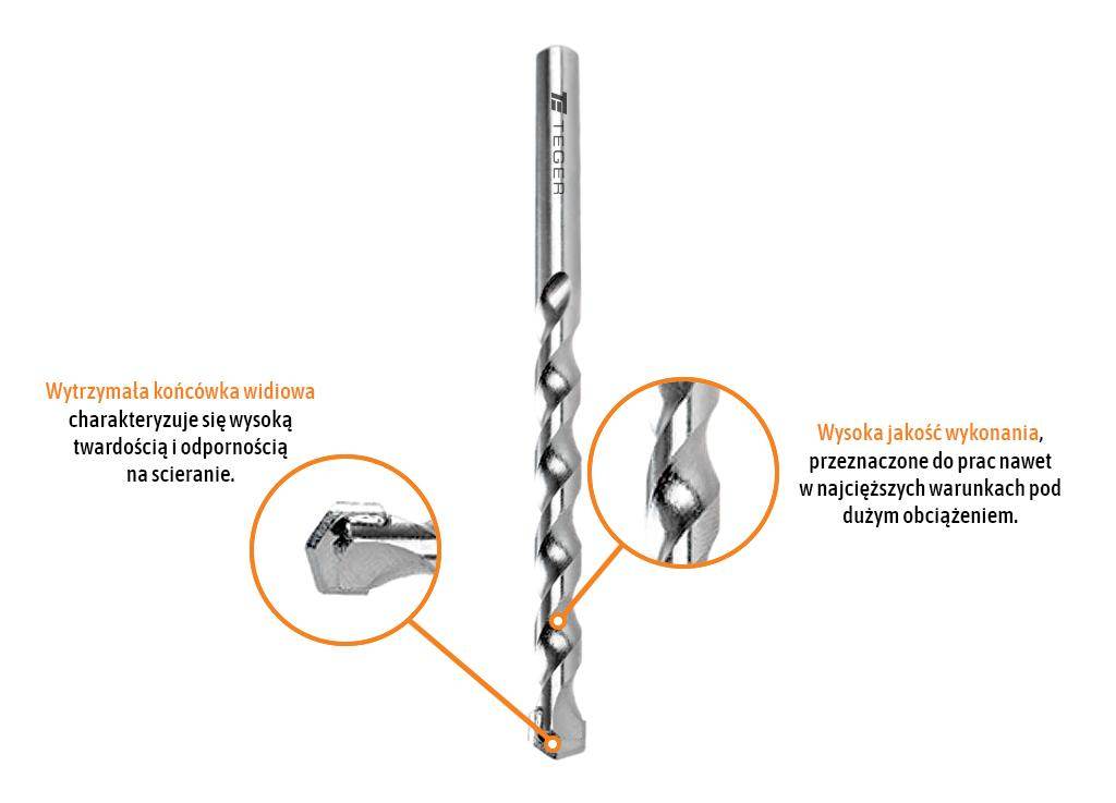 Wiertło do betonu widiowe – standard marki teger / wykonane wg normy din 8039 niezwykle trwałe, twarde i odporne na ścieranie. Wysoka jakość wykonania, przeznaczone do prac nawet w najcięższych warunkach pod dużym obciążeniem. Posiadają precyzyjnie wykonaną widje, która zapewnia wysoką jakość i trwałość wiertła.
