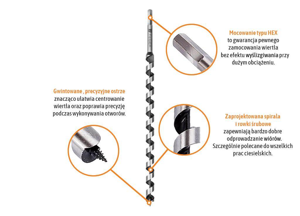 Wiertło do drewna kręte – świder marki teger / przeznaczone do wydajnego dokładnego wiercenia w miękkim i twardym drewnie, belkach o dużym przekroju belkach stropowych, deskach podłogowych w płytach wiórowych i sklejce, szczególnie polecane do prac ciesielskich. Gwintowane, precyzyjne ostrze znacząco ułatwia centrowanie wiertła oraz poprawia precyzję podczas wykonywania otworów.