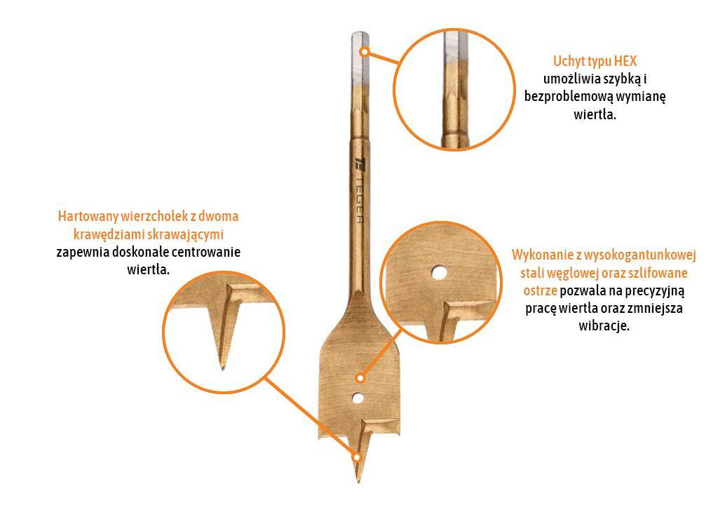 Wiertło do drewna płaskie – łopatkowe marki teger / przeznaczone do wiercenia dużych otworów w drewnie, płycie meblowej, tworzywach sztucznych, płycie gipsowej oraz gazobetonie. Hartowany wierzchołek z dwoma krawędziami skrawającymi zapewnia doskonałe centrowanie wiertła. Wykonanie z wysokogatunkowej stali węglowej oraz szlifowane ostrze pozwala na precyzyjną pracę wiertła oraz zmniejsza wibrację.