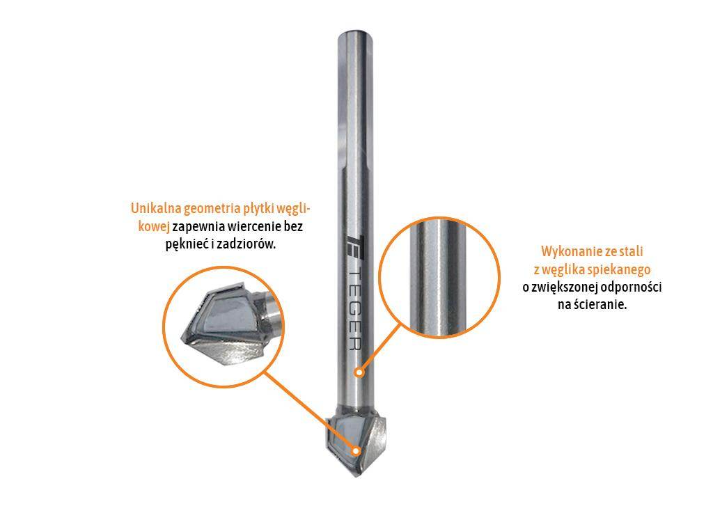 Wiertło do szkła i glazury marki teger / specjalistyczne wiertło wykonane ze stali z węglika spiekanego, przeznaczone do wiercenia otworów w szkle, porcelanie i ceramice, wykonane ze stali z węglika spiekalnego o zwiększonej odporności na ścieranie. Unikalna geometria płytki węglowej zapewnia wiercenie bez pęknięć i zadziorów.
