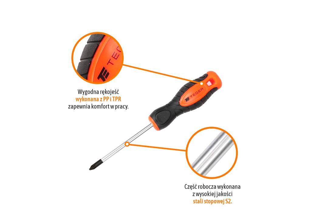 Wkrętak krzyżowy pz 2x100mm /teger przeznaczony do odkręcania i dokręcania wkrętów i śrub z końcówką typu pz. Wytrzymały trwały, odporny na odkształcenia i uszkodzenia. Wyposażony w magnetyczny grot, zwiększający precyzję i wygodę pracy. Ergonomiczny uchwyt wykonany z antypoślizgowego tworzywa pp i tpr idealnie dopasowuje się do dłoni zapewniając tym samym pewny chwyt i bezpieczną pracę. Trzpień wykonany z wysokogatunkowej stali stopowej s2 zwiększającej wytrzymałość narzędzi.