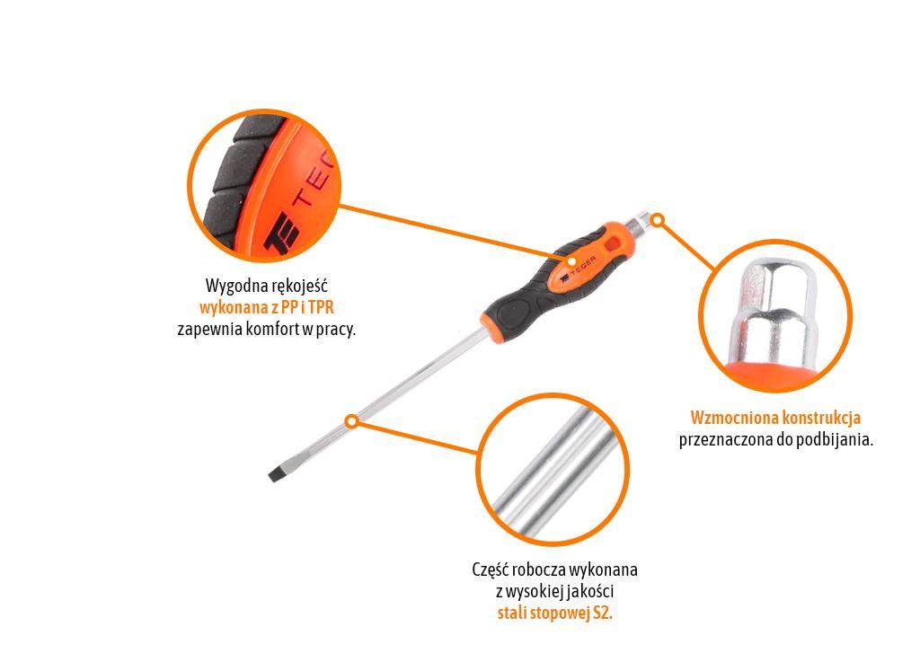 Wkrętak płaski do pobijania sl 6x150mm / teger przeznaczony do pobijania odkręcania i dokręcania wkrętów i śrub z końcówką typu sl. Wytrzymały trwały, odporny na odkształcenia i uszkodzenia. Wyposażony w magnetyczny grot zwiększający precyzję i wygodę pracy oraz rdzeń stalowy przez całą długość wkrętaka umożliwiający pracę przez pobijanie. Ergonomiczny uchwyt wykonany z antypoślizgowego tworzywa pp i tpr idealnie dopasowuje się do dłoni zapewniając tym samym pewny chwyt i bezpieczną pracę. Trzpień wykonany z wysokogatunkowej stali stopowej s2 zwiększającej wytrzymałość narzędzi.