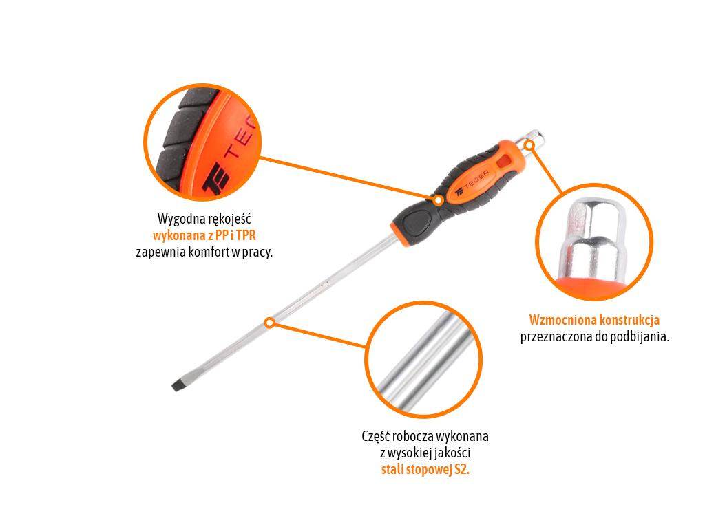 Wkrętak płaski do pobijania sl 8x200mm / teger przeznaczony do pobijania odkręcania i dokręcania wkrętów i śrub z końcówką typu sl. Wytrzymały trwały, odporny na odkształcenia i uszkodzenia. Wyposażony w magnetyczny grot zwiększający precyzję i wygodę pracy oraz rdzeń stalowy przez całą długość wkrętaka umożliwiający pracę przez pobijanie. Ergonomiczny uchwyt wykonany z antypoślizgowego tworzywa pp i tpr idealnie dopasowuje się do dłoni zapewniając tym samym pewny chwyt i bezpieczną pracę. Trzpień wykonany z wysokogatunkowej stali stopowej s2 zwiększającej wytrzymałość narzędzi.