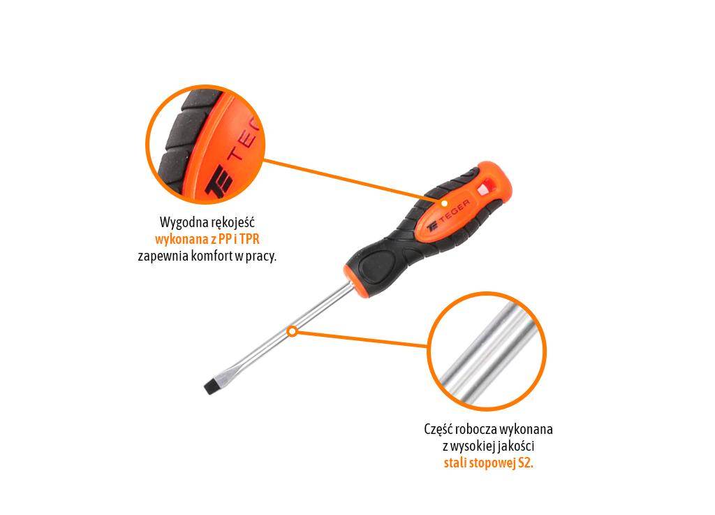 Wkrętak płaski sl 6,5x100mm / teger przeznaczony do odkręcania i dokręcania wkrętów i śrub z końcówką typu sl. Wytrzymały trwały, odporny na odkształcenia i uszkodzenia. Wyposażony w magnetyczny grot, szlifowany po obu stronach zwiększający precyzję i wygodę pracy. Ergonomiczny uchwyt wykonany z antypoślizgowego tworzywa pp i tpr idealnie dopasowuje się do dłoni zapewniając tym samym pewny chwyt i bezpieczną pracę. Trzpień wykonany z wysokogatunkowej stali stopowej s2 zwiększającej wytrzymałość narzędzi.