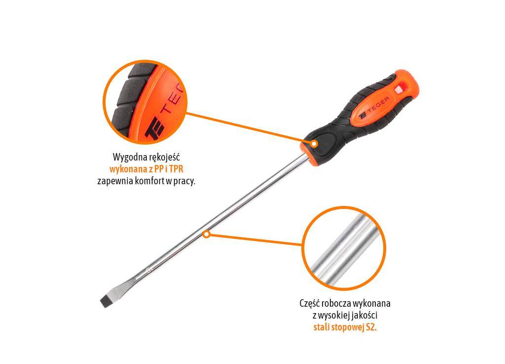 Wkrętak płaski sl 8,0x200mm / teger przeznaczony do odkręcania i dokręcania wkrętów i śrub z końcówką typu sl. Wytrzymały trwały, odporny na odkształcenia i uszkodzenia. Wyposażony w magnetyczny grot, szlifowany po obu stronach zwiększający precyzję i wygodę pracy. Ergonomiczny uchwyt wykonany z antypoślizgowego tworzywa pp i tpr idealnie dopasowuje się do dłoni zapewniając tym samym pewny chwyt i bezpieczną pracę. Trzpień wykonany z wysokogatunkowej stali stopowej s2 zwiększającej wytrzymałość narzędzi.