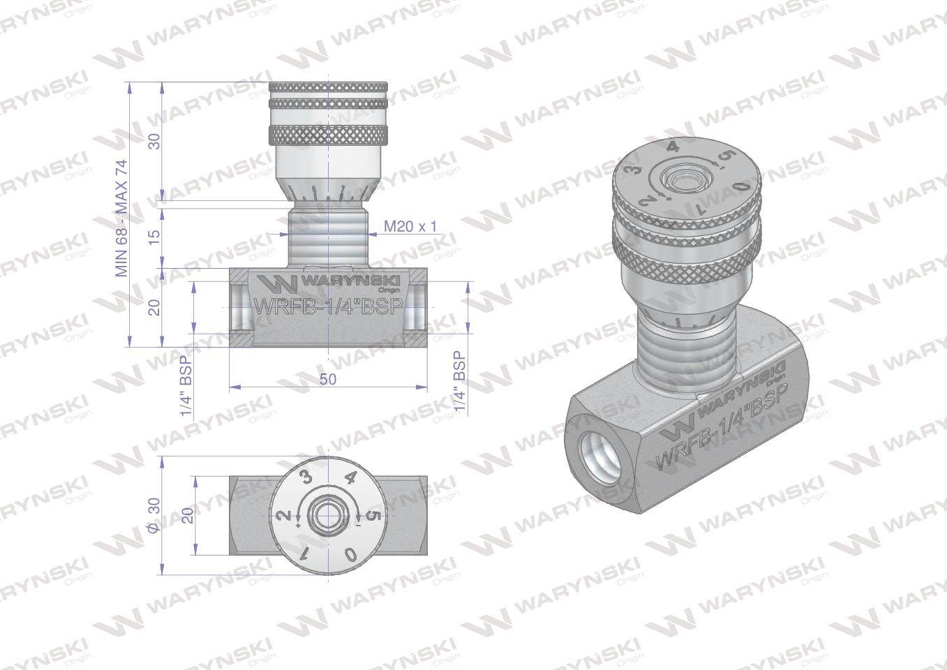 Zawór dławiący wrfb 90 z gwintem wewnętrzym 1/4″bsp waryński. Zadaniem zaworów dławiących jest oddziaływanie na wartość strumienia cieczy roboczej dostarczanej do odbiornika. Dzięki regulacji/zmianie natężenia przepływu oleju steruje się np. prędkością roboczą siłowników hydraulicznych lub silników hydraulicznych, które są zasilane pompą hydrauliczną o stałej wydajności. Dławienie działa w obu kierunkach przepływu. Powtarzalność ustawienia można sprawdzić na skali umieszczonej na pokrętle. Strumień objętości zależy od różnicy ciśnień i od lepkości oleju hydraulicznego. Zaprojektowane są zgodnie z wymogami wymiarowymi i jakościowymi, które określają szczegółowo charakterystykę pracy i wymiary. Dzięki mocnej kontrukcji nadają się do zastosowań podczas trudnych warunków pracy w maszynach rolniczych i budowlanych.
